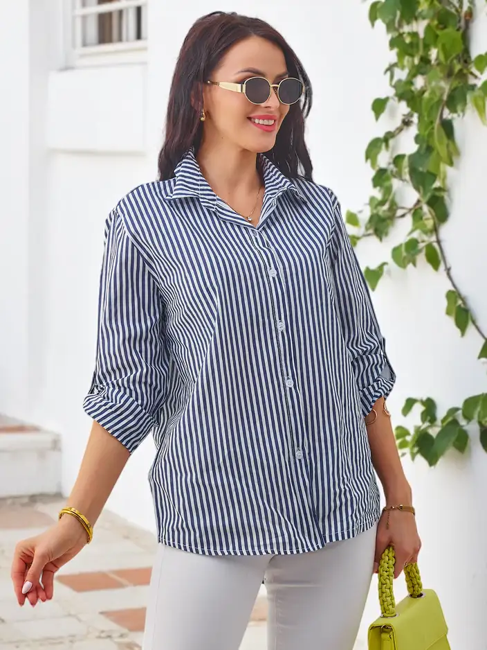 Римска мода Котонена дамска риза на райе с връзка в долната част