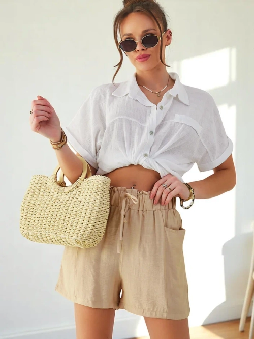 - Леки дамски платнени шорти. Висока талия с два джоба и еластичен пояс. Идеален избор за лятото! ЗАБЕЛЕЖКА: Точност на измерването (+/-) 1 см.