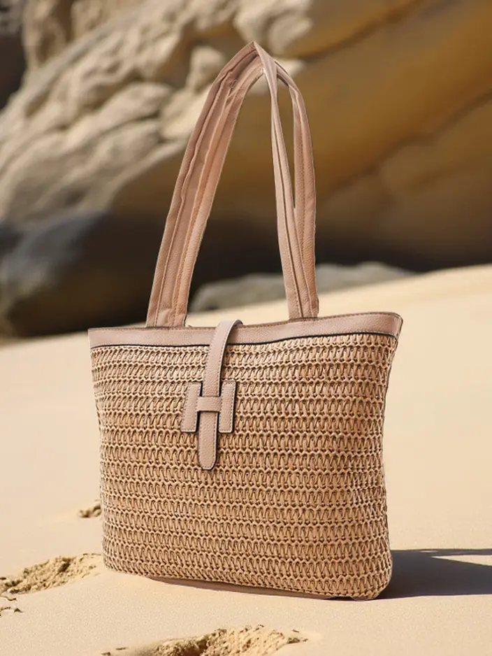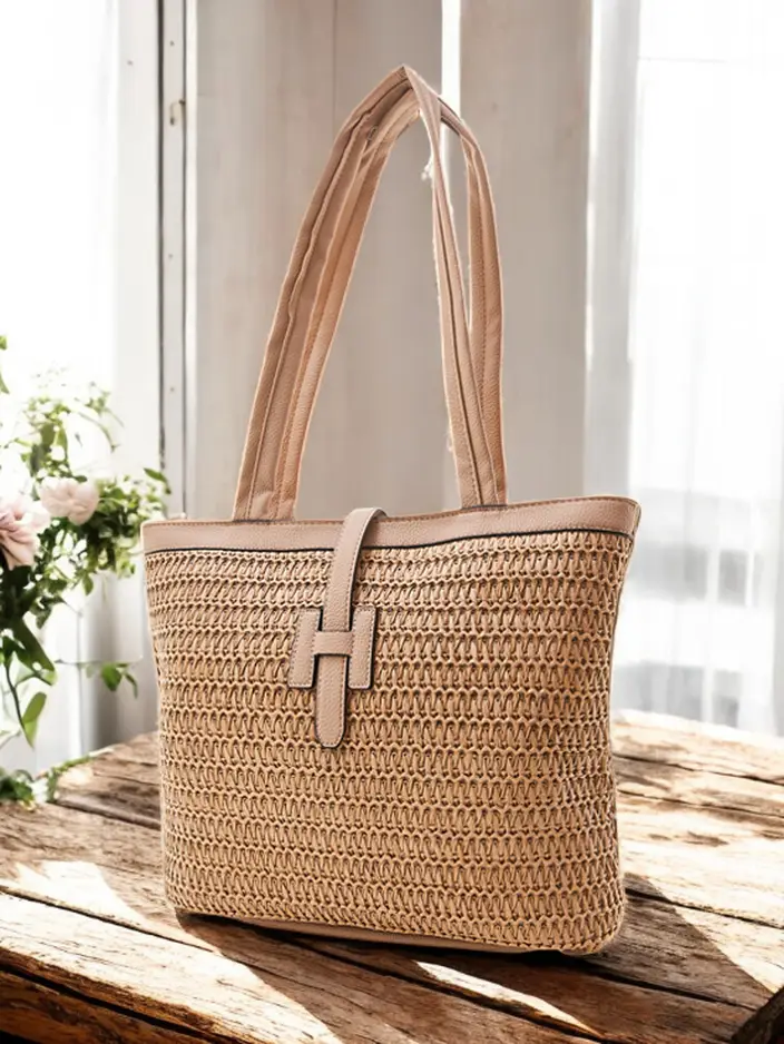 - Голяма дамска чанта, изработена от тъкана слама. Моделът се закопчава с цип, има 1 основно отделение и допълнителен 1 джоб. Идеален аксесоар за летни тоалети!