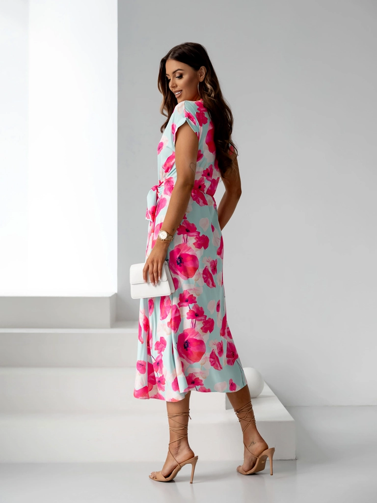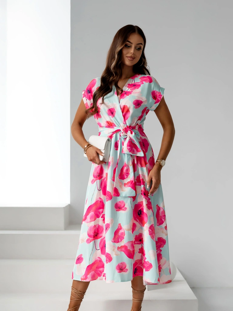 - Рокля миди за жени с къси ръкави и обвито деколте, украсена с пролетни цветя – лека, елегантна и перфектна за топли дни.