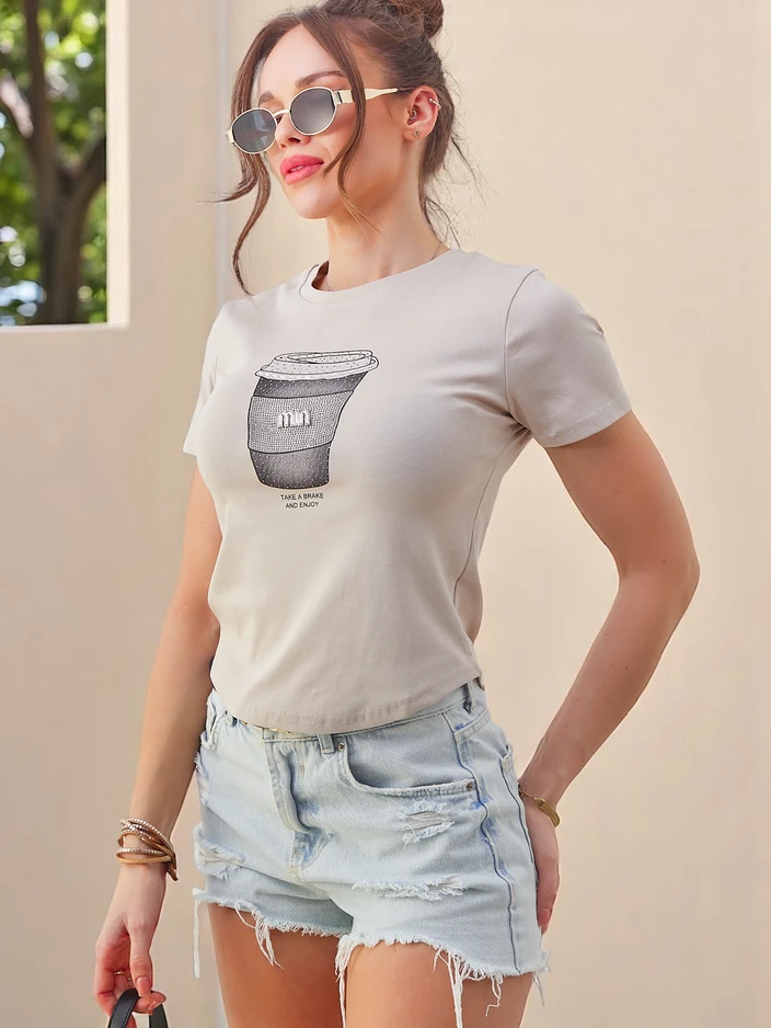 - Дамска algodón тениска с принт, украсен с ринстоуни, съчетаваща комфорт с фина искра. Перфектна за ежедневни тоалети, добавя уникален чар на всеки вид.