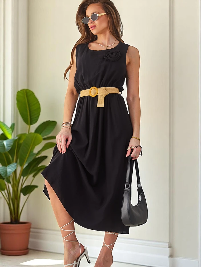 Рокля миди с презрамки на Royalfashion за жени, с кръгло деколте и декоративно цвете