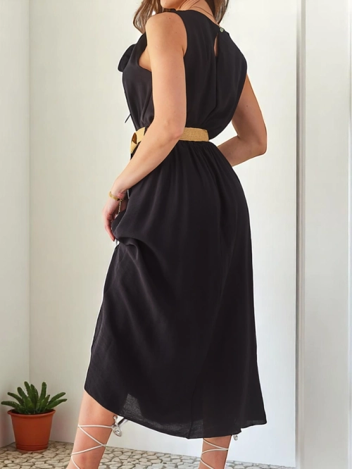• Елегантна миди рокля с презрамки, кръгло деколте и флорален акцент. Моделът акцентира на талията с еластична лента. Лека, въздушна и комфортна – перфектна за летни дни и вечери навън.