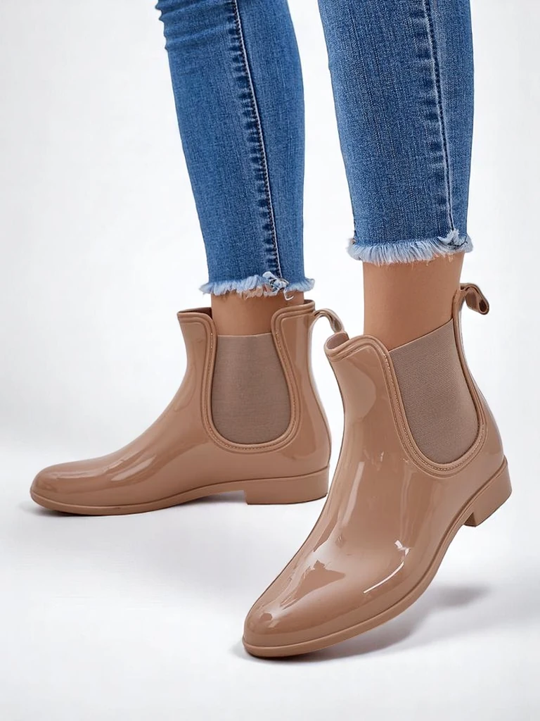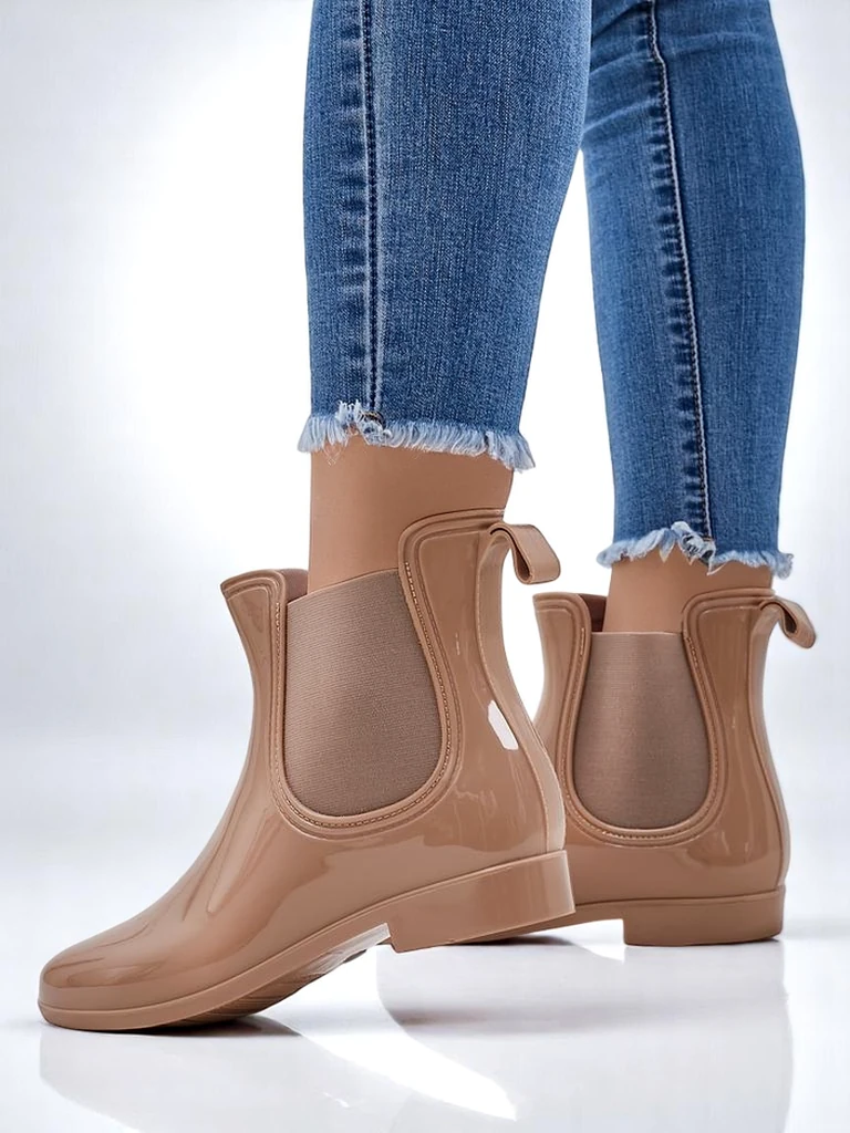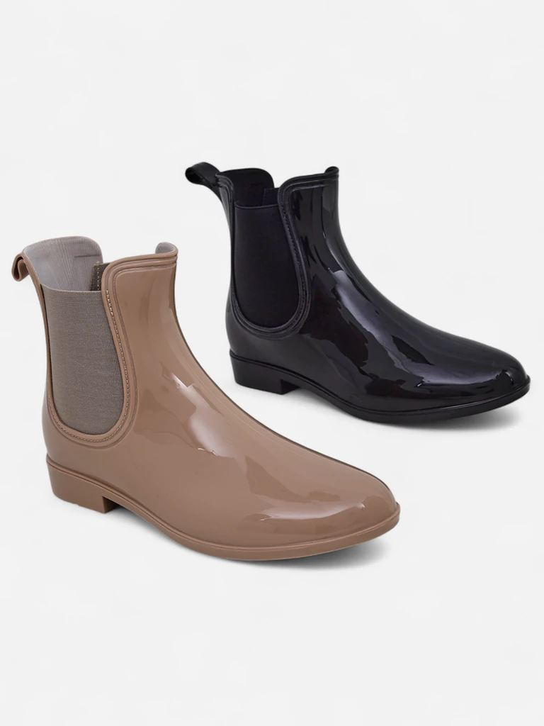 - Класически дамски чизми, изработени от гумен материал с лаково покритие. Стелката е изработена от текстил. Перфектни обувки за дъждовни есенни дни!