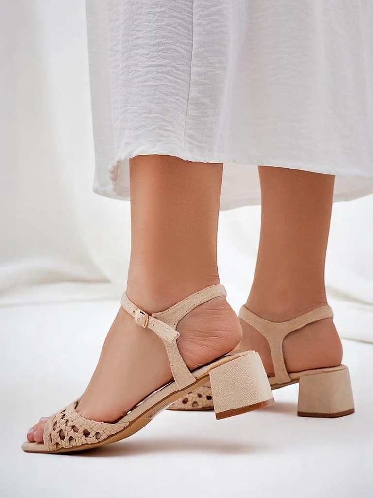 • Женски сандали с нисък ток - перфектната идея за горещите летни дни. Моделът е изработен от екологична велурена кожа и разполага с екологична кожена стелка. Обувките се закопчават с катарама. Комбинация от стил и комфорт!