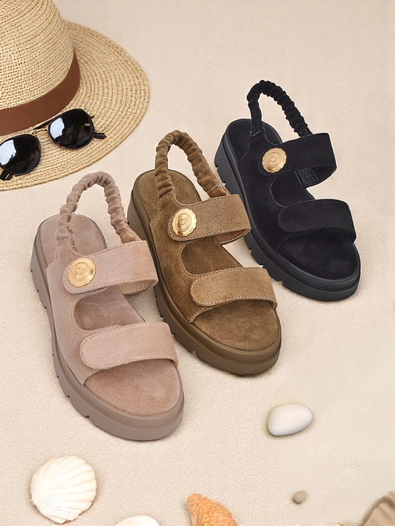 Открийте лекотата и изключителния комфорт с дамските сандали Royalfashion Callista, вдъхновени от италианския стил. Моделът е изработен от висококачествен екологичен велур, както отвън, така и отвътре (стелка), което осигурява мекота, проветривост и приятно докосване за кожата на краката. Платформата с височина 5 см, изработена от лек, еластичен материал, гарантира отлична амортизация и удобство дори при по-дълги разходки. Закопчаването с велкро позволява бързо регулиране според индивидуалните нужди, а липсата на бомбе осигурява отлична вентилация - идеално решение за топлите дни. Отличителна черта на модела е модерният, минималистичен дизайн без шарки и декоративен акцент, наподобяващ монета в златист цвят, който придава на цялостната визия фина елегантност. Сандалите идеално се вписват в актуалните тенденции - масивна платформа, бежови нюанси и естествени материали са водещи този сезон на модните подиуми и улиците на градовете.:- мека, приятна за кожата подплата от еко велур,- еластичната подметка повишава комфорта при ежедневно носене,- леки и стабилни - идеални както за разходки, така и за работа,- закопчаването с велкро позволява бързо обуване и събуване,- неутралният, бежов цвят подхожда на повечето стилове.:1. За всеки ден - комбинирайте сандалите с бели дънки 7/8 и широка ленена риза или тениска. 2. В бохо стил - съчетайте с лятна макси рокля на цветя и голяма плетена чанта.3. Градски стил - изберете пастелни шорти и лека жилетка.:За да запазите свежестта и естетиката, почиствайте сандалите внимателно с влажна кърпа и четка за велур. Избягвайте контакт с вода и продължително излагане на слънце. Съхранявайте на проветриво място, най-добре в платнена торбичка, за да избегнете деформации.Изберете сандали Royalfashion Callista, ако цените модерността, удобството и непреходната елегантност. Този модел със сигурност ще се превърне във ваш летен фаворит, независимо от повода.