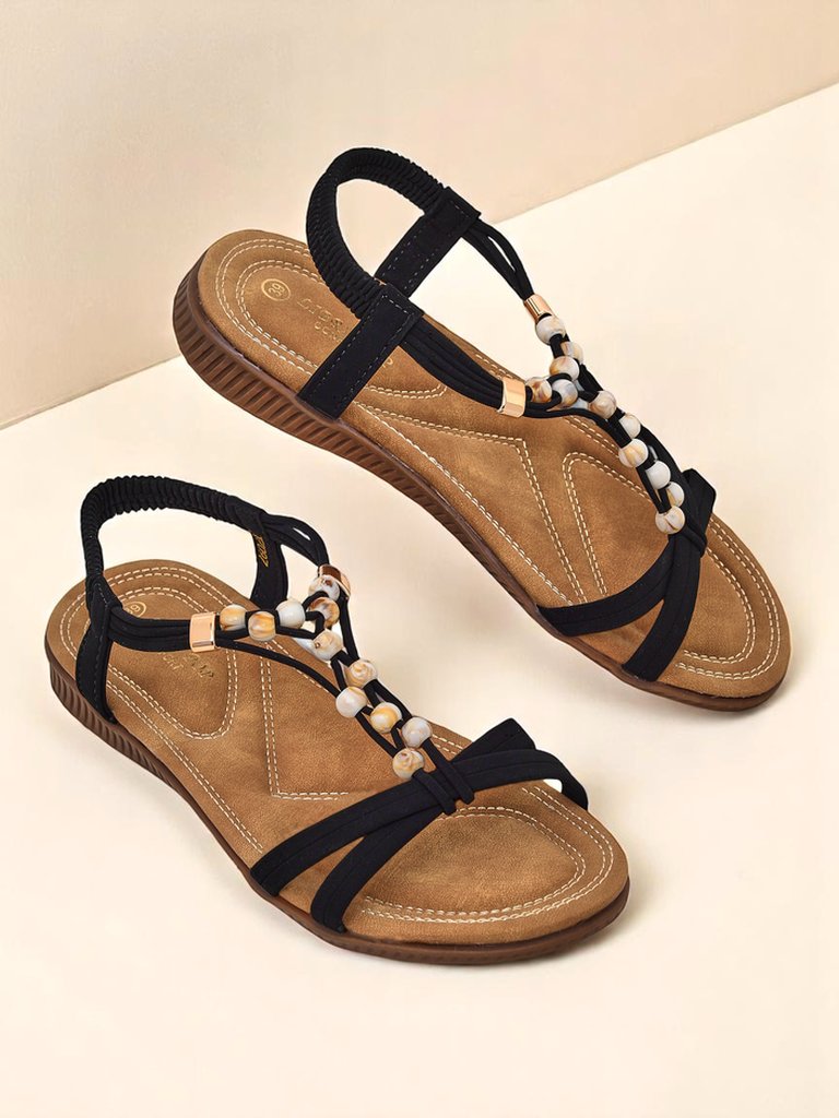 - Дамски равни сандали – перфектната идея за горещите летни дни. Каишки от приятна екологична кожа. Предната част е украсена с елегантни сплетени каишки и мънисти. Обувки без закопчаване.