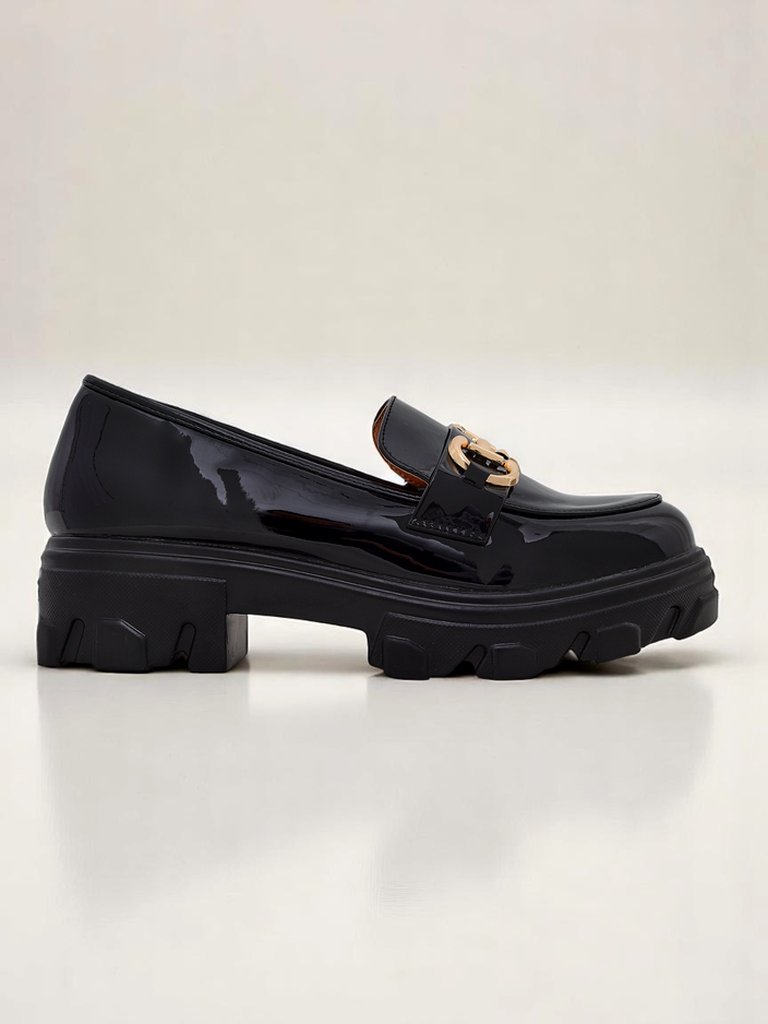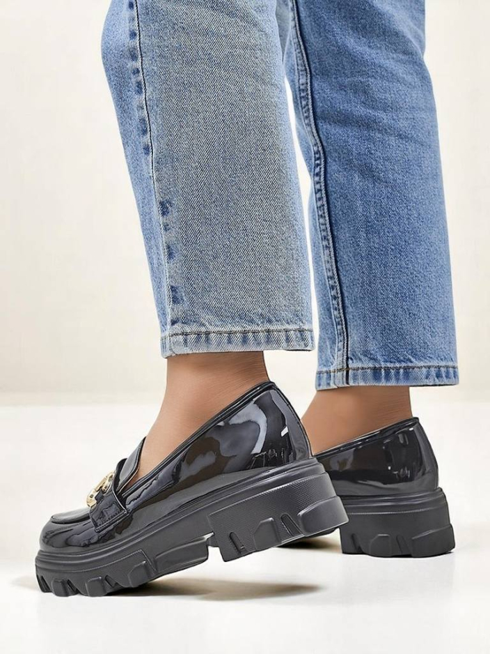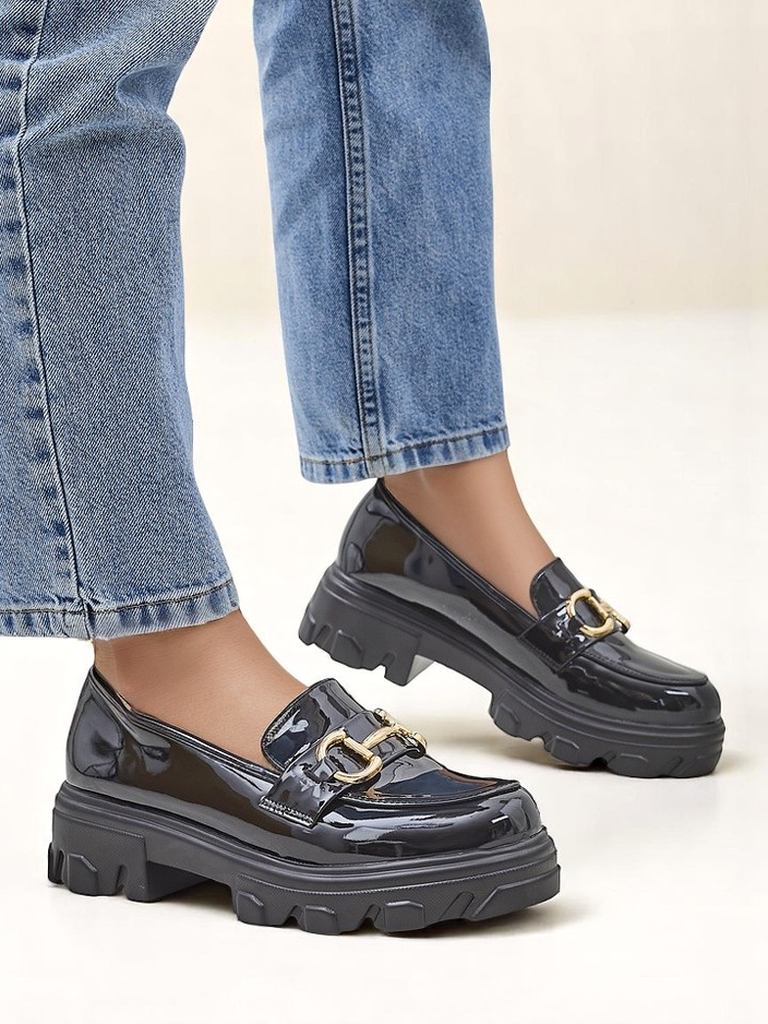 Стилни дамски мокасини, изработени от еко лак в елегантен черен цвят. Този модел се отличава с масивна, релефна подметка, която осигурява комфорт при носене и отлична стабилност. В предната част има златна декорация в стил horsebit, която придава изискан характер на обувките. Вътрешността е подплатена с мек материал, който повишава комфорта при носене. Идеални както за ежедневни, така и за по-елегантни визии. Отличен избор за есенно-пролетния сезон.