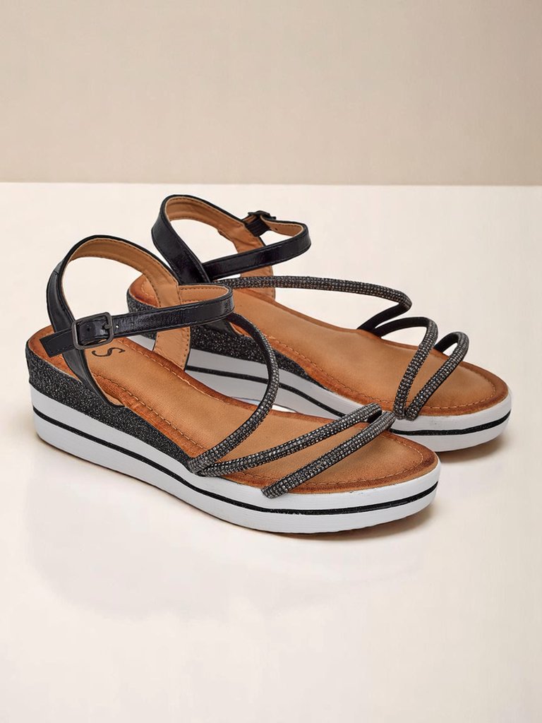 - Открийте елегантността с тези сандали. Изумителни на клина, украсени с блестящи стрази, те перфектно подчертават летния блясък. Комбинация от удобство и луксозен вид – идеални за всеки специален повод!