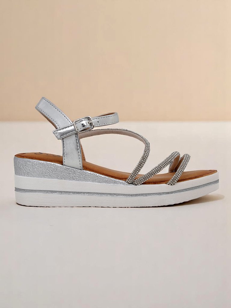 - Открийте елегантността с тези сандали. Изумителни на клина, украсени с блестящи стрази, те перфектно подчертават летния блясък. Комбинация от удобство и луксозен вид – идеални за всеки специален повод!