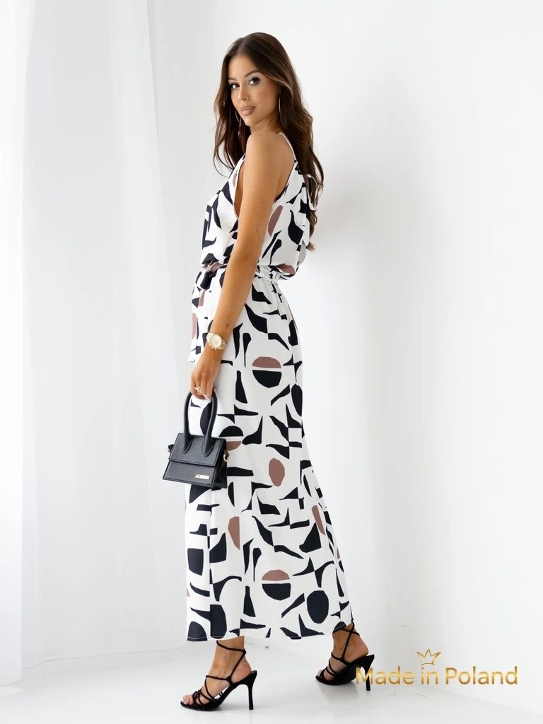 - Елегантна дамска миди рокля с презрамки и колан с геометричен десен е лек и женствен избор за топлите дни. Нежният принт и вталената кройка осигуряват стилна и удобна визия.