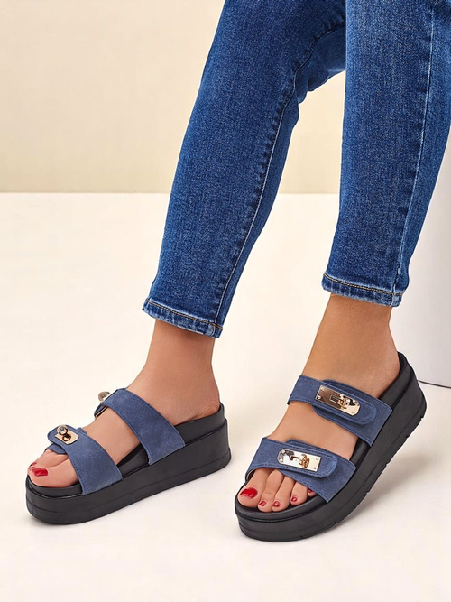 Дамските чехли Aurelia са олицетворение на летния стил и комфорт. Изработени от висококачествена велур, те осигуряват мекота и удобство през целия ден. Здравата, черна подметка от пластмаса гарантира стабилност и издръжливост, а едновременно с това придава на чехлите модерен вид. Златните метални катарами са елегантен акцент, подчертаващ уникалния им дизайн.