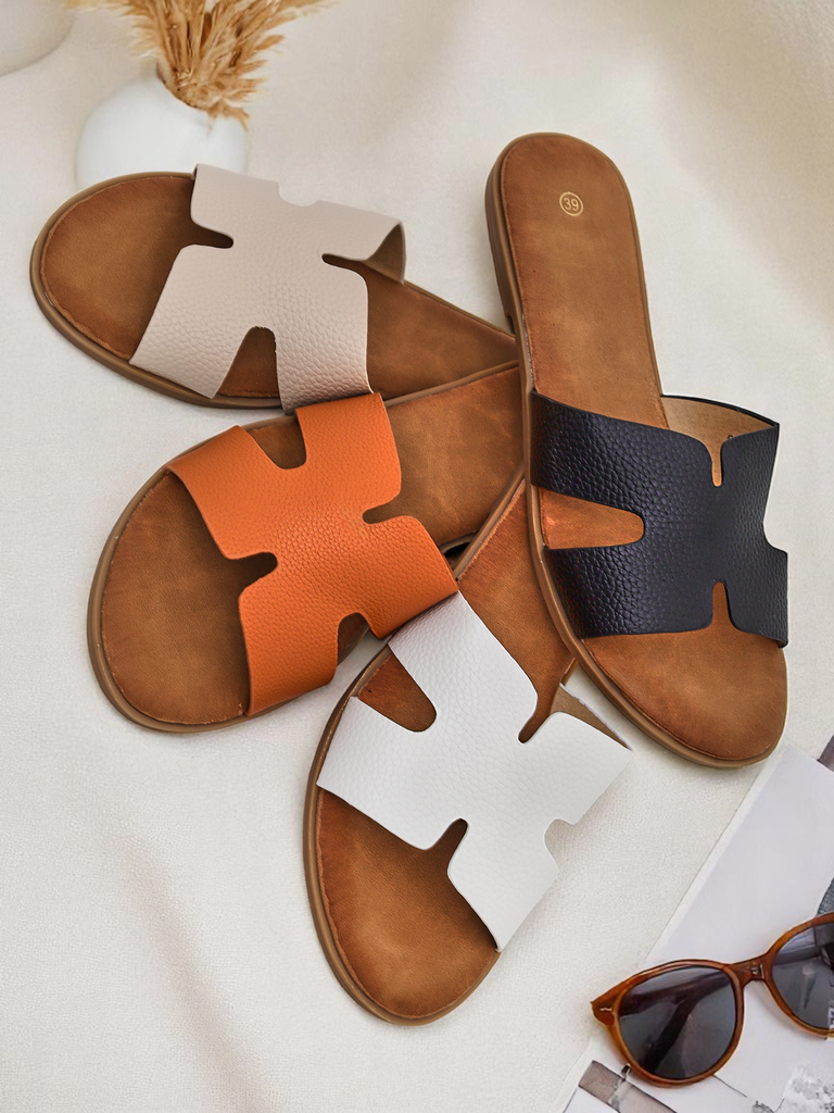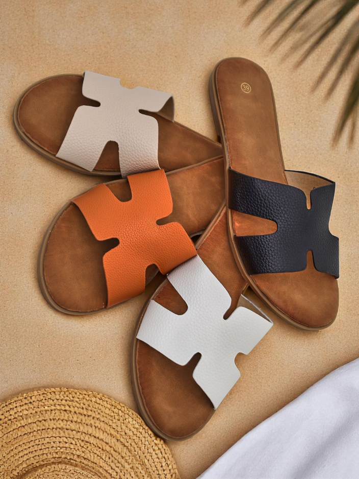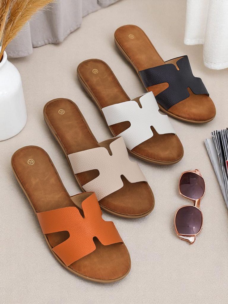 - Страхотни дамски чехли с равна подметка. Изработени от еко кожа. Перфектен избор за ежедневно носене!