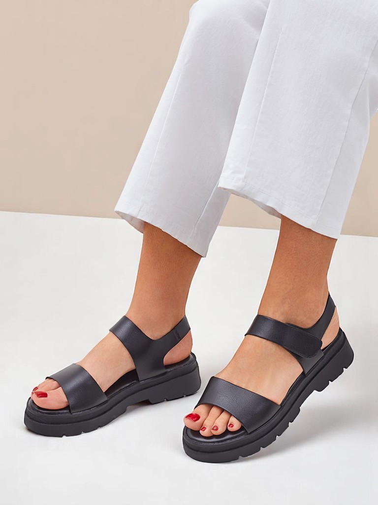 • Дамски сандали с равна подметка – перфектният избор за горещите летни дни. Каишките са изработени от приятна еко кожа. Сандалите се закопчават с велкро лепенка. Най-добрият вариант за ежедневно носене!