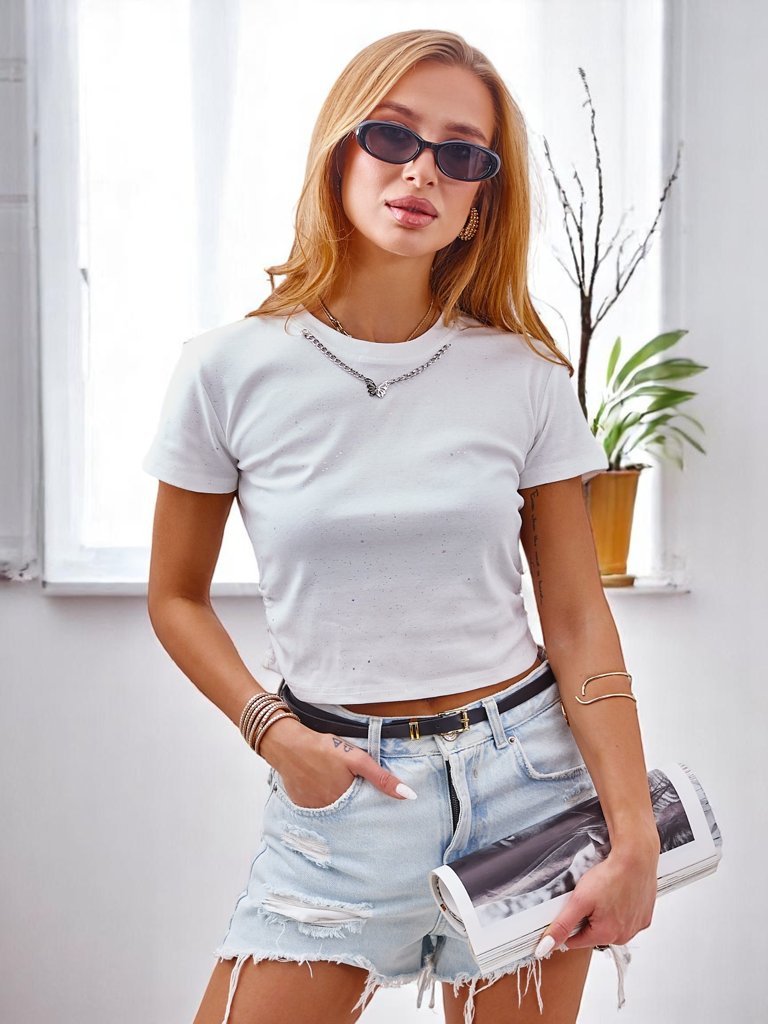Royalfashion Памучна дамска тениска със странични набирания, верижка и блясък