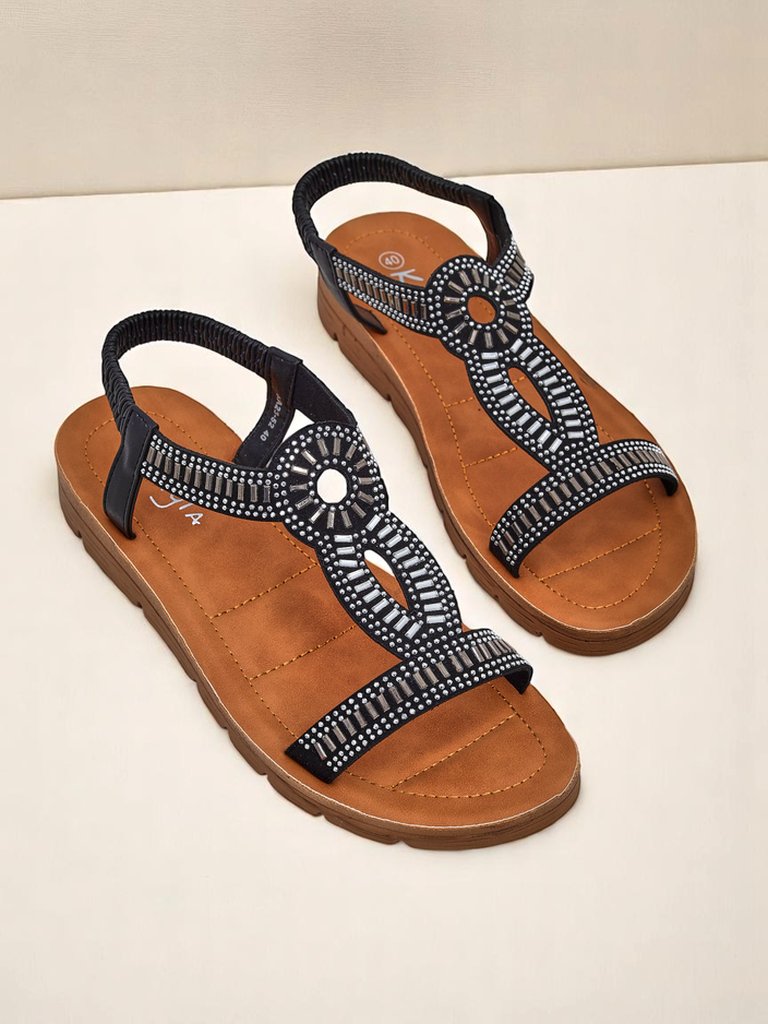 - Дамски сандали с равна подметка, изработени от еко кожа, украсени с каишки с камъни. Съчетание от комфорт и фин блясък, идеални за летни дни и вечерни излизания.