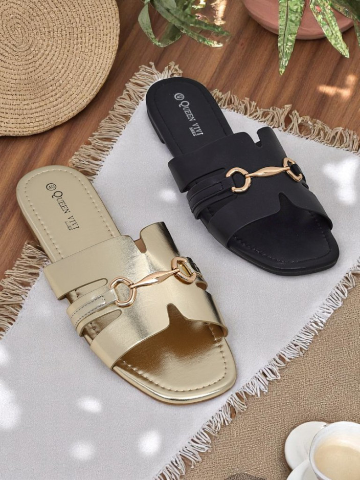 - Чехли, изработени от еко кожа, декорирани с фин златист орнамент. Елегантна семплост и удобство, които подхождат на всеки летен тоалет.