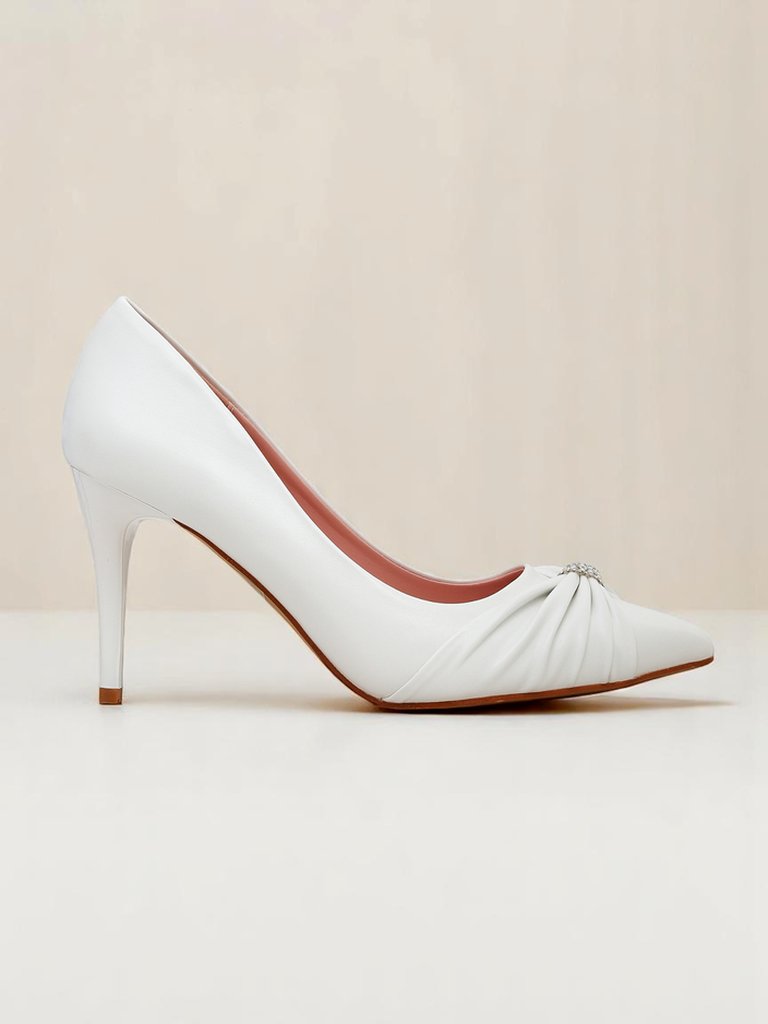 - Дамски обувки от еко кожа с тънък ток и заострен връх. Декорирани с набор и камъче, те съчетават елегантност с фин блясък, идеални за специални поводи.