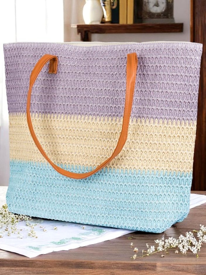 - Голяма плетена сламена чанта с пъстър мотив от широки райета. С едно отделение, джоб и цип. Стилна и просторна – идеална за лятото и ваканциите!