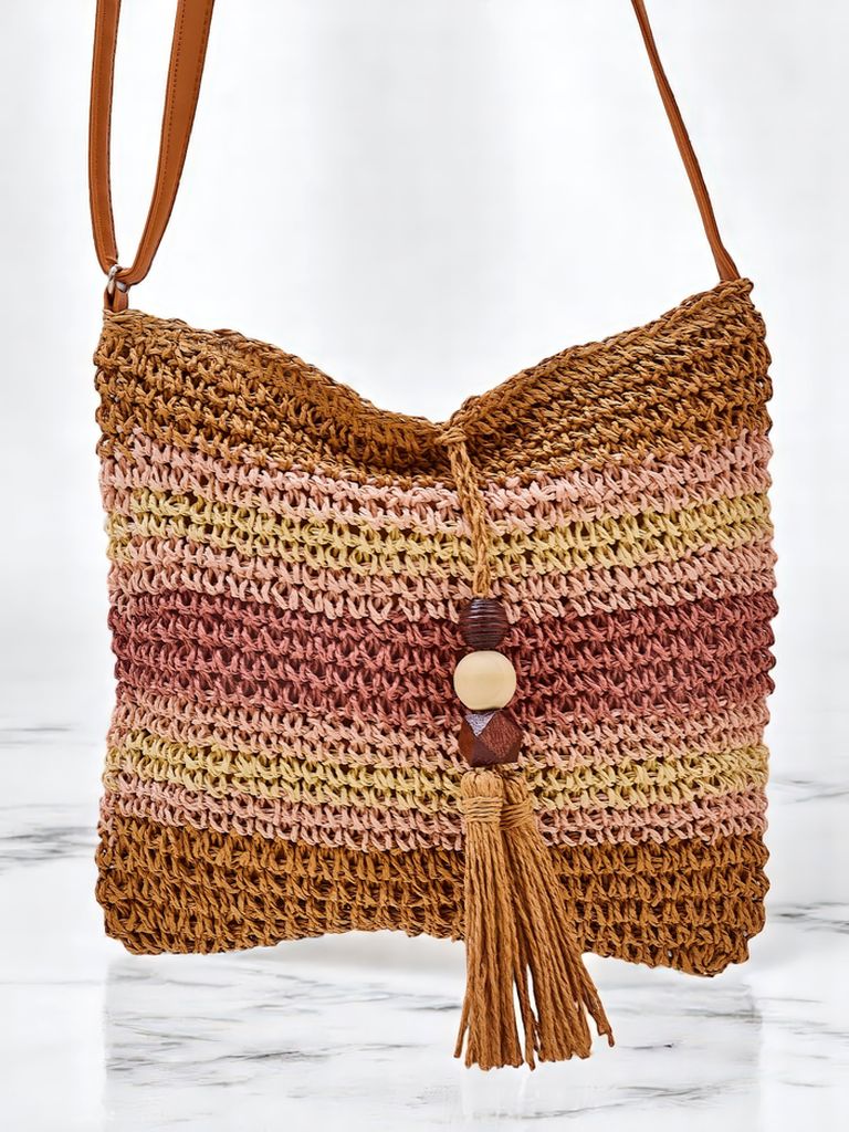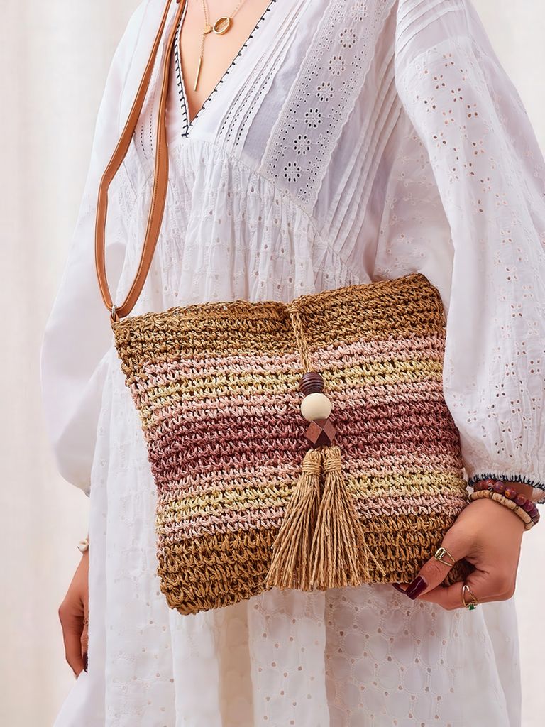 - Малка плетена сламена чанта с райета и декоративен ключодържател. 1 отделение, джоб с цип. Стилна и лека – идеална за лятото и разходки!