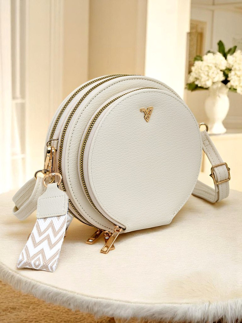 - Малка, кръгла многофункционална дамска чанта с 3 отделения. Стилна и практична – идеална за ежедневна употреба и излизания. Побира най-необходимото, като същевременно запазва елегантен външен вид.