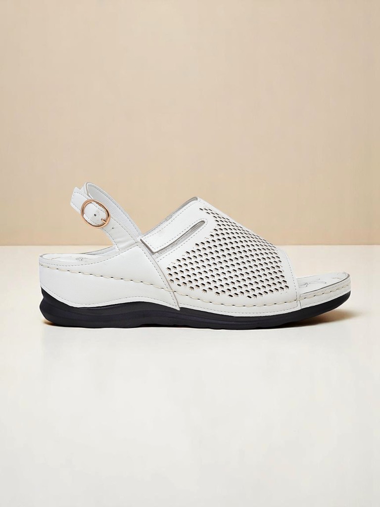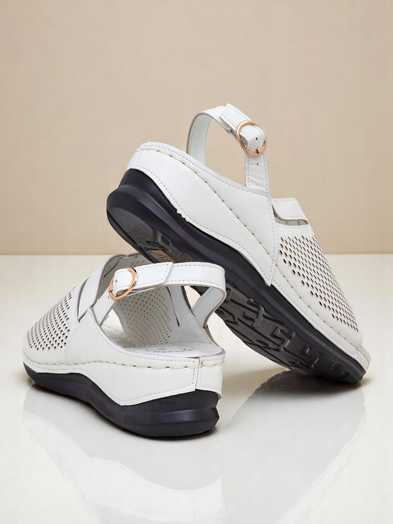 Сандалите Calcebianca са комбинация от италиански стил, антични традиции и модерен комфорт. Изработени от висококачествена естествена лицева кожа, те гарантират не само естетичен външен вид, но и дълготрайна издръжливост. Лазерно изрязаните шарки на горната част осигуряват отлична вентилация и модерен, фин визуален ефект, който се вписва в най-новите тенденции на летните обувки с леко ретро излъчване. Кожената стелка с флорален принт и деликатното, регулируемо закопчаване с каишка осигуряват прилягане към индивидуалните нужди, като същевременно защитават стъпалото и подсилват правилното му положение.