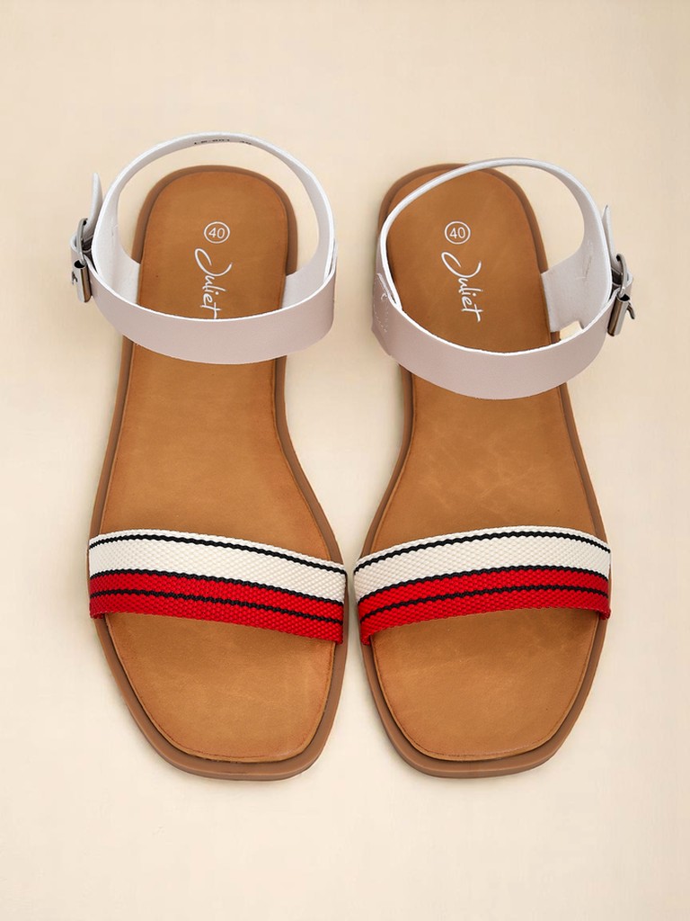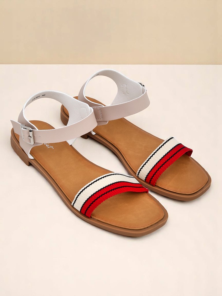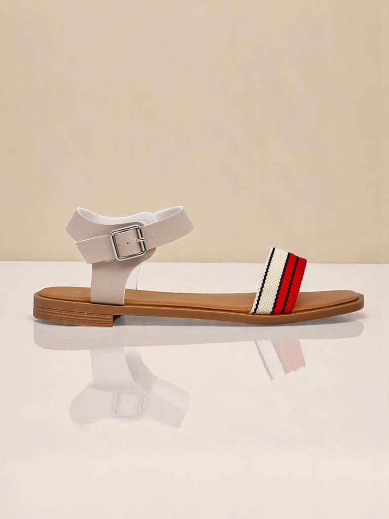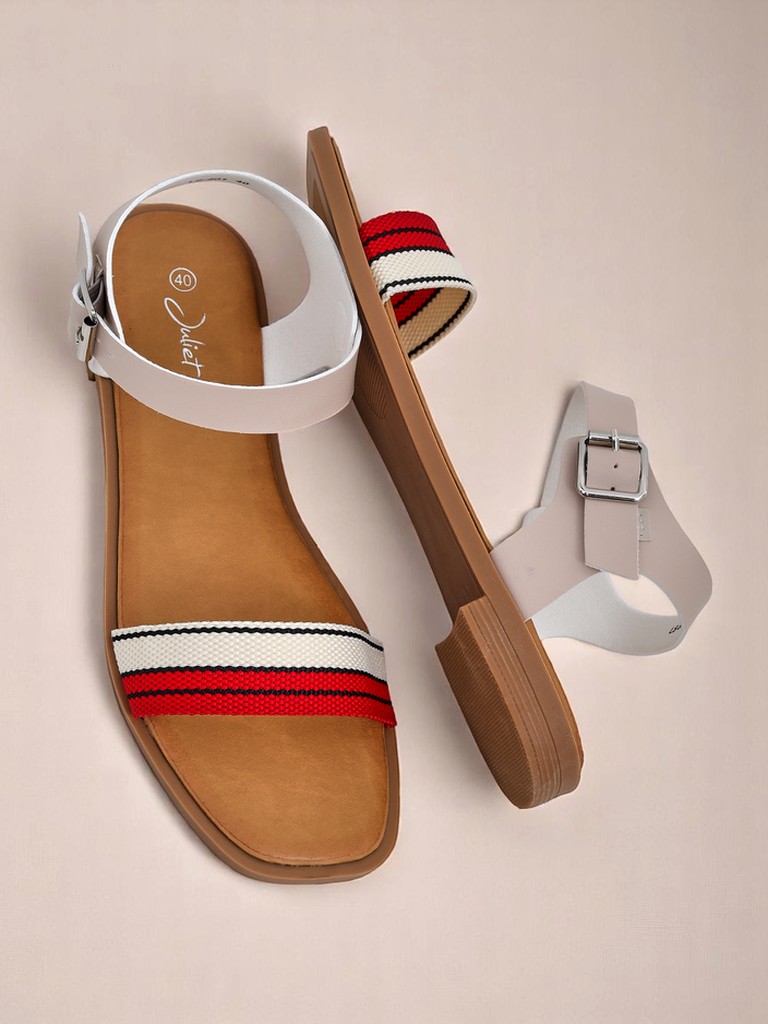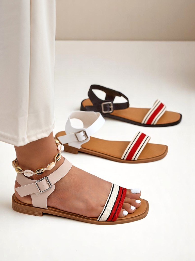 - Стилни сандали с равна подметка, изработени от мека еко кожа. Текстилната каишка придава лекота, а закопчалката осигурява удобно ежедневно прилягане.