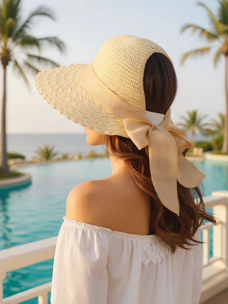 - Дамска сламена шапка с декоративна периферия, отвор отзад и панделка с голяма панделка. Лека и дишаща, идеална за лятото, плажа и стилни, женствени визии!