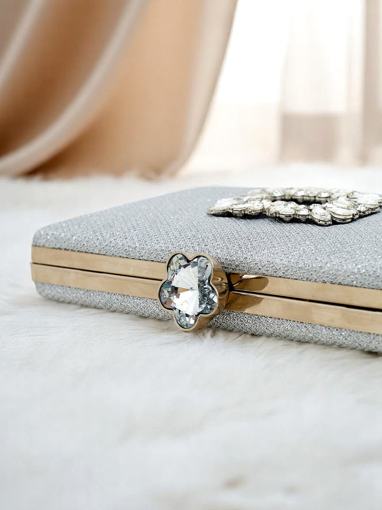 - Чанта тип плик, изработена от еко кожа, покрита с плат с блестяща нишка и фин релеф. Декорирана с камъче, закопчава се с тик-так копче, с подвижна верижка – блясък и елегантност!