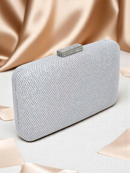 - Чанта тип плик, изработена от еко кожа, покрита с плат със сияещ конец и деликатен релеф. Закопчава се с копче, с подвижна верижка — елегантност и блясък в едно.