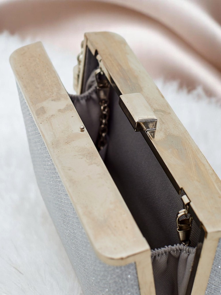 • Малък клъч с бляскава материя, закопчаващ се с копче. С подвижни презрамки — може да се носи в ръка или на рамо. Перфектен избор за вечер, изпълнена с блясък и елегантност!