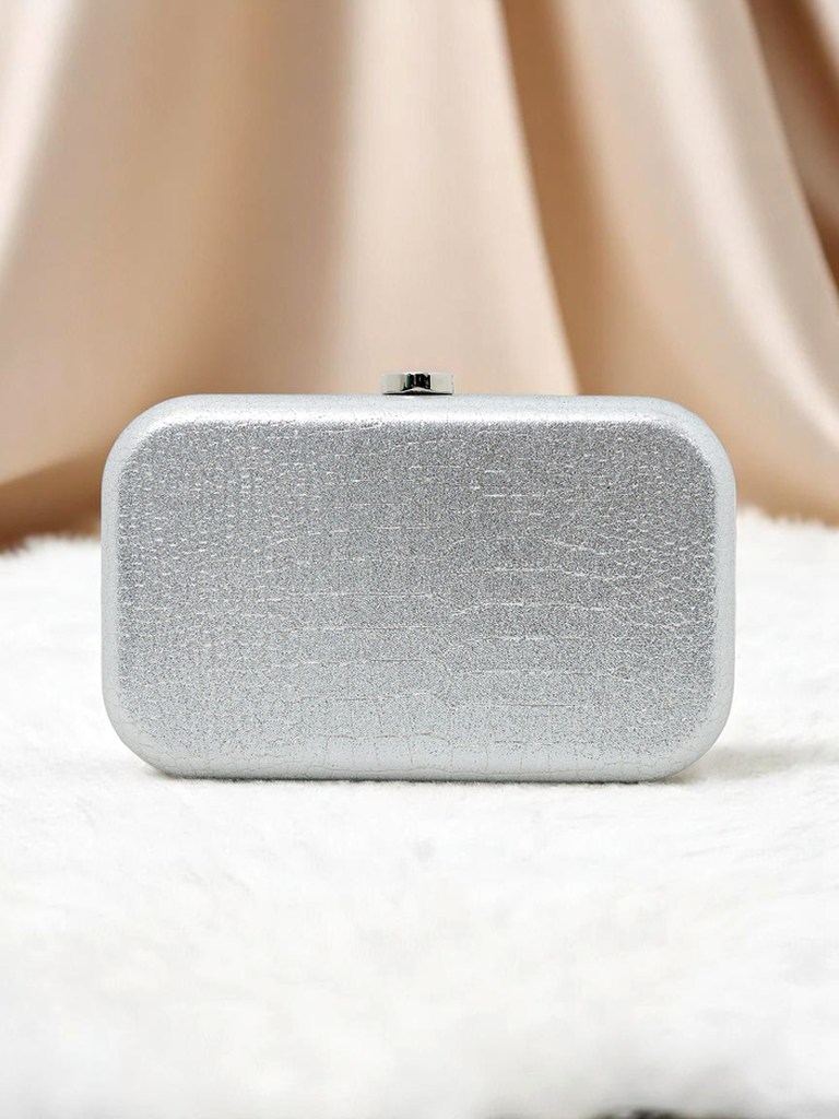 - Чанта тип плик, изработена от еко кожа, покрита с плат със сияеща нишка и фино релефно покритие. Закопчава се със закопчалка, с подвижна верижка—елегантност и блясък в едно.