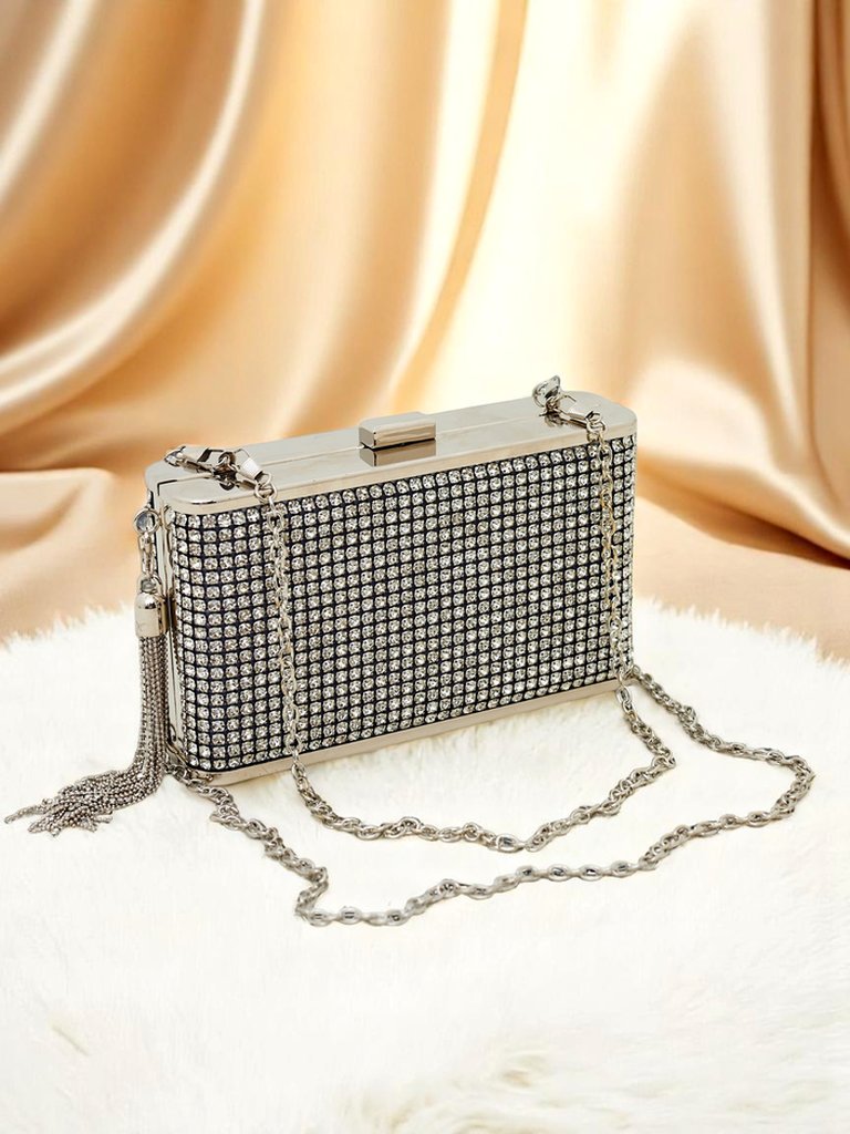 - Вечерна клъч чанта с камъчета, закопчаване с копче. Малка, елегантна, с подвижни презрамки—можете да я носите в ръка или на рамо. Придава блясък на всяка визия!