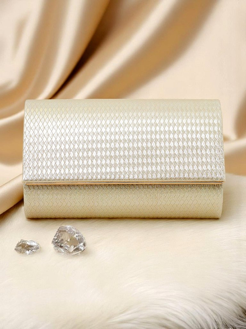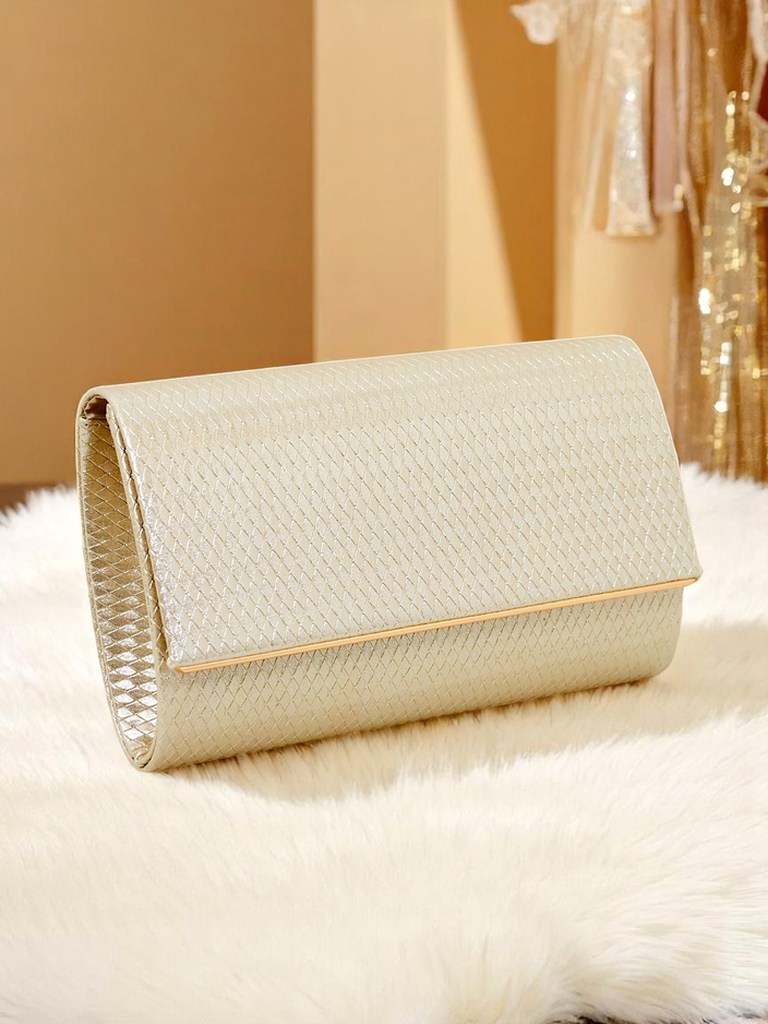 - Чанта тип плик, изработена от еко кожа, покрита с плат с блестяща нишка и деликатен релеф. Закопчава се с магнит, с отделяща се дръжка – идеална за вечерни излизания.