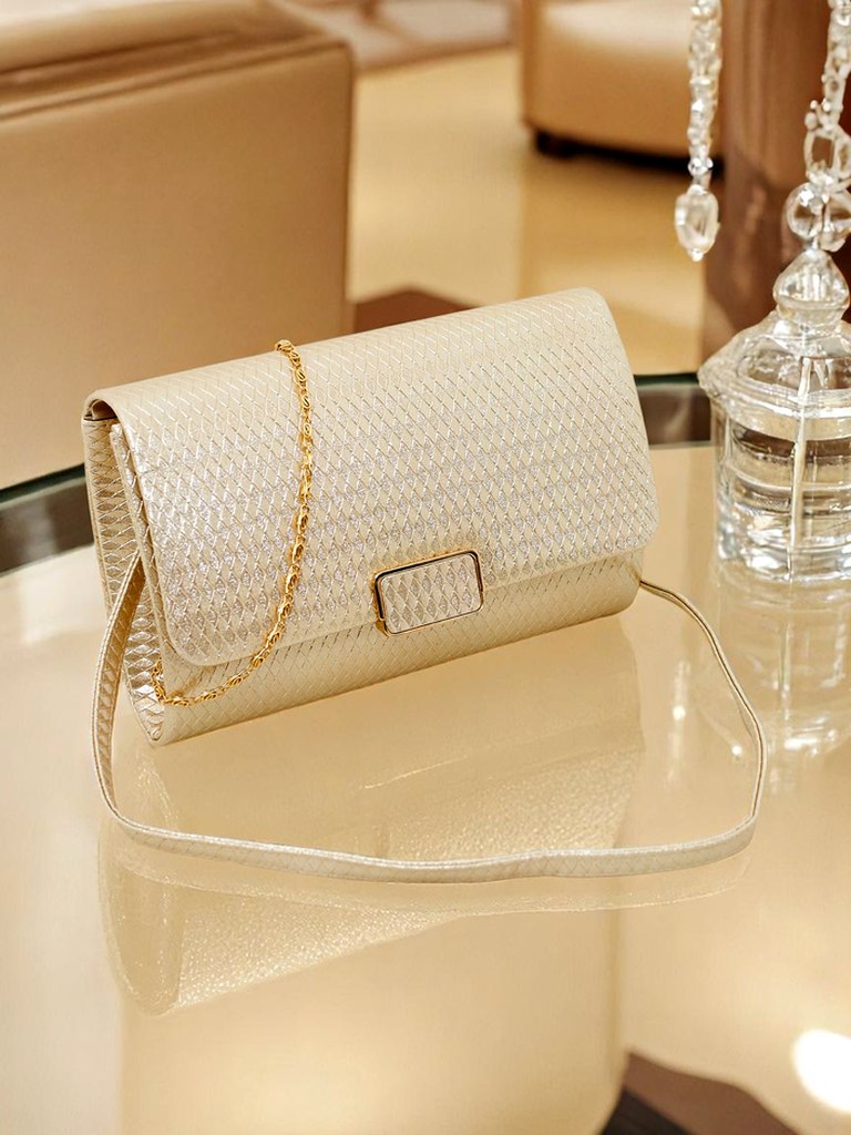 - Елегантна чанта тип плик, изработена от еко кожа, покрита с плат с блестяща нишка и фин релеф. Закопчава се с магнит, с подвижна дръжка — идеална за вечерта.