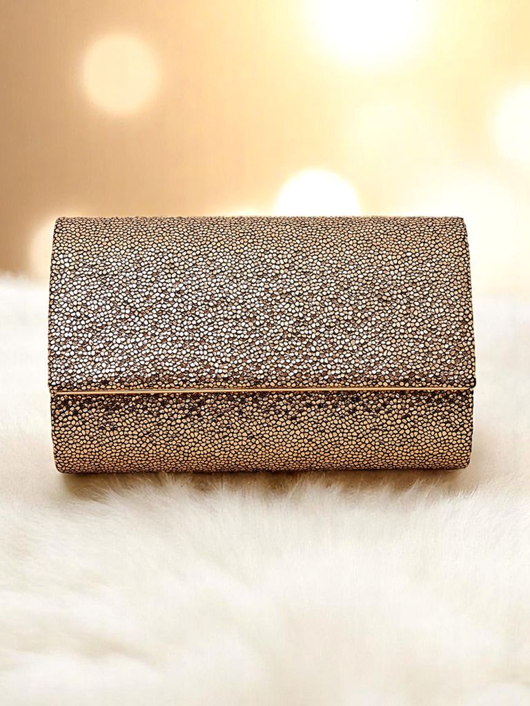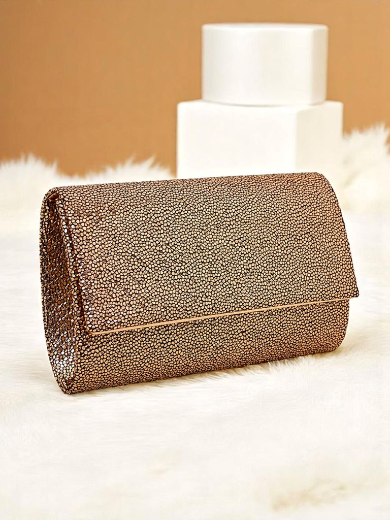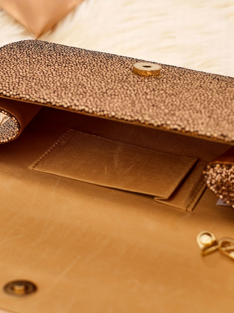 • Стилна клъч чанта, изработена от еко кожа, покрита с плътна брокатена тъкан. Закопчава се с магнит, с подвижна каишка – идеална за вечерни излизания и специални поводи.