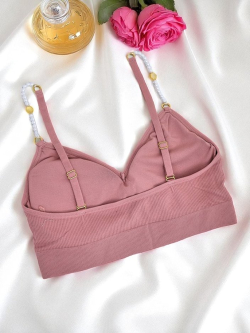 - Дамски подплатен спортен сутиен с декоративни, регулируеми презрамки, без закопчаване. Свалящи се подплънки. Релефната материя съчетава стил и удобство – идеална за тренировки и ежедневна употреба.