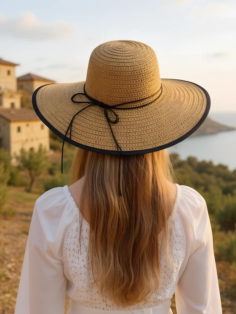 - Лекият сламен шал с широка периферия, украсен с финa панделка. Перфектен за лятото, предпазва от слънце и добавя стил към всеки летен тоалет.