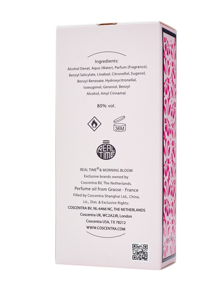 Съставки: Alcohol Denat, Aqua (вода), Parfum (аромат), Benzyl Salicylate, Linalool, Citronellol, Eugenol, Benz Benzoate, Hydroxycitronellal, Isoeugenol, Geraniol, Benzyl Alcohol, Amyl Cinnamal