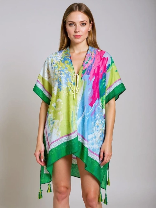 - Лятна плажна туника тип парео с V-образно деколте и асиметричен подгъв е стилен must-have за почивка. Ефирната, лека материя и ефектният десен подчертават женствеността, а свободната кройка осигурява комфорт в горещите дни. Идеална за плажа и летните разх