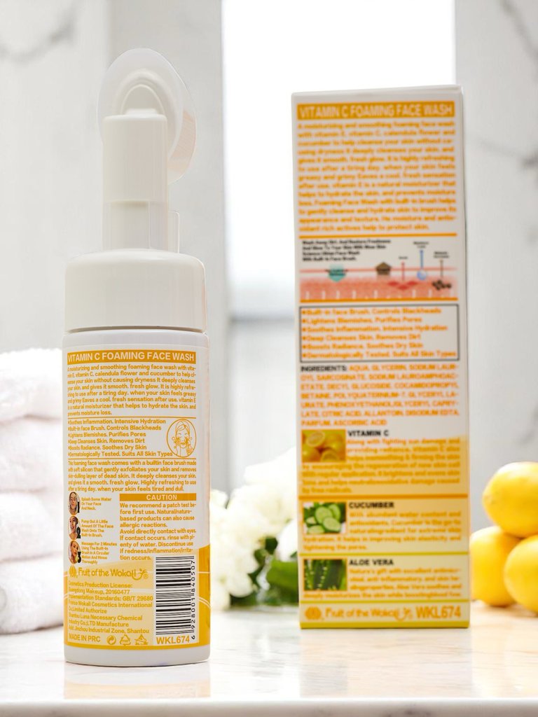 - Почистваща пяна за лице с витамин C и четка. Нежно премахва замърсяванията, озарява кожата и има противостареещи свойства, оставяйки тена свеж, гладък и сияен.