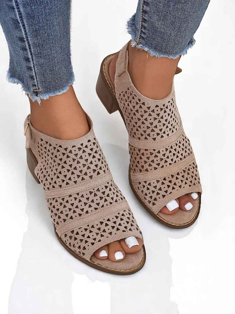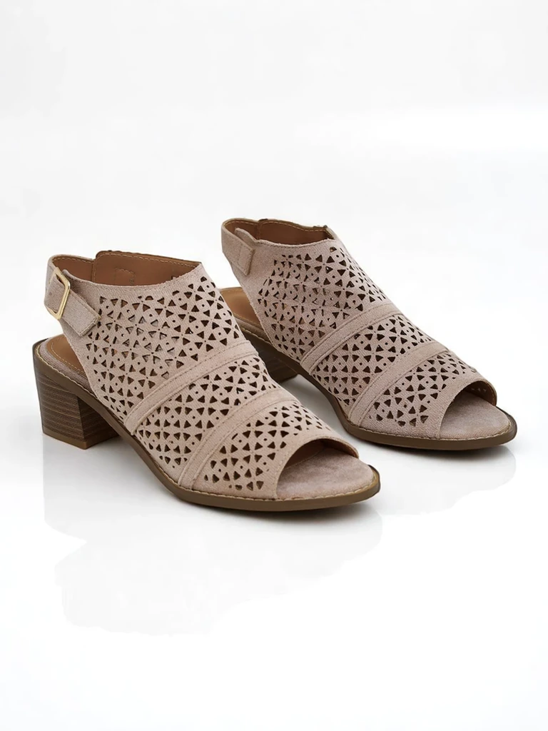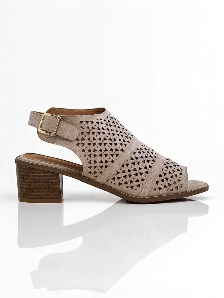 - Ажурни сандали на нисък ток, изработени от еко велур и кожена стелка. Закопчават се с катарама, леки и удобни – идеални за топлите дни с елегантност и комфорт!