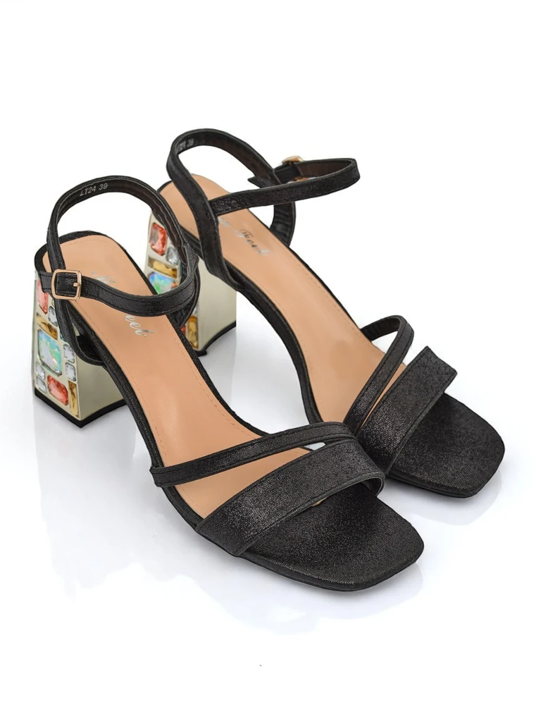 - Елегантни дамски сандали на декоративен ток с цветни кристали. Брокатена тъкан, еко кожена стелка и закопчаване с катарама създават ефектен и удобен модел за специални поводи.