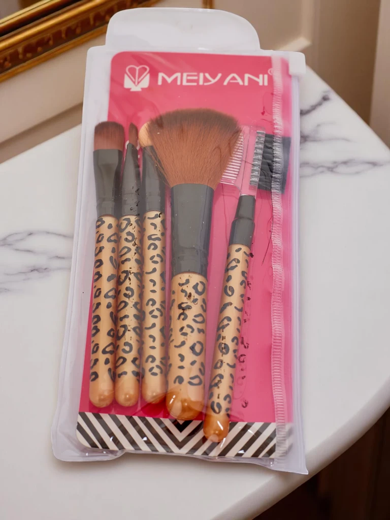 - Комплект четки за грим – за устни, очи, нанасяне на пудра, с гъбичка и гребенче за мигли.