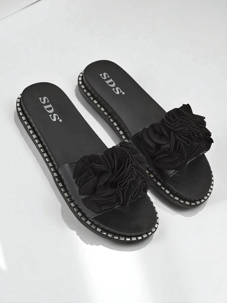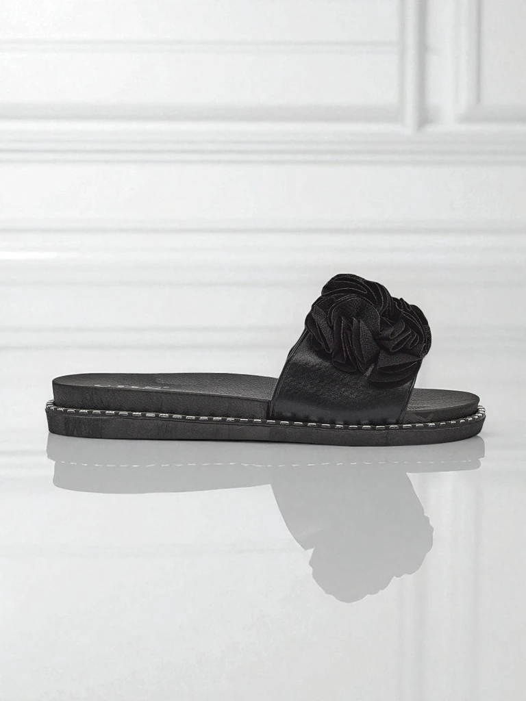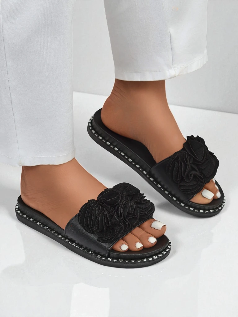 - Дамски чехли с равна подметка, изработени от еко кожа, с модерен флорален аксесоар. Лек, удобен и стилен избор за лятото – екологична елегантност за ежедневието!