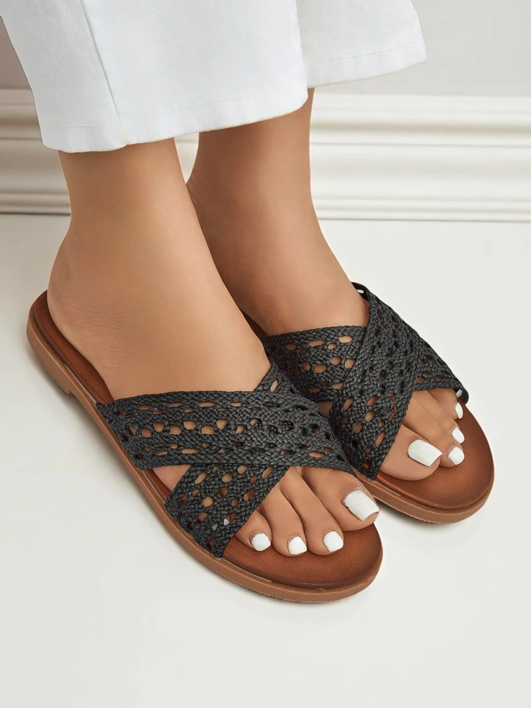 - Дамски чехли от еко кожа с равна подметка и модерен плитка детайл. Удобни и стилни, идеални за лятото и ежедневните разходки. Лекият дизайн осигурява комфорт през целия ден.
