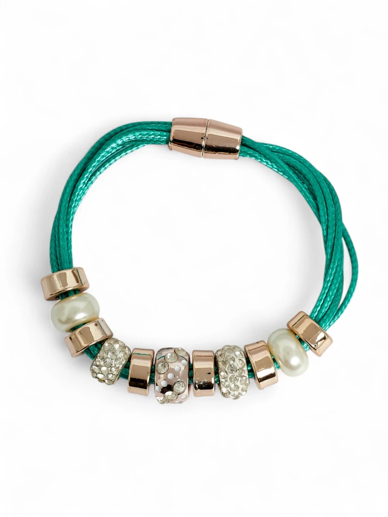 - Ефектна дамска гривна на връвчици с магнитно закопчаване. Украсена със сребърни мъниста с цирконии, които блестят красиво на светлината. Стилен аксесоар за ежедневни и вечерни визии.