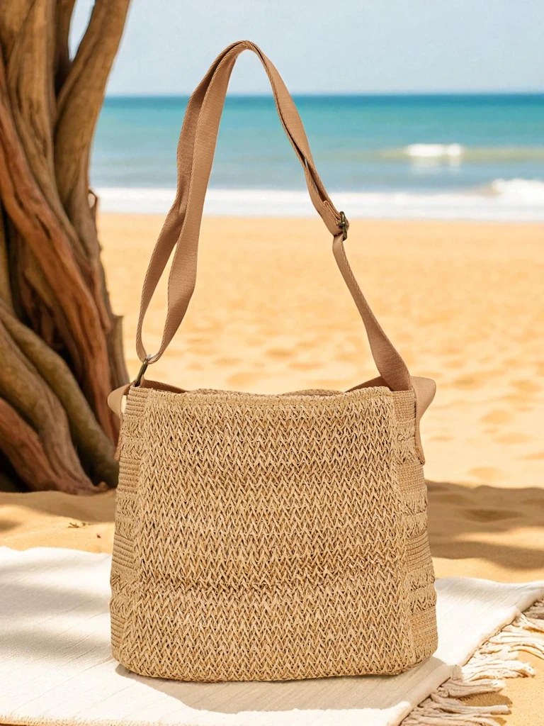 - Стилна сламена чанта с едно отделение и джоб, закопчаваща се с цип. Лека и просторна, идеална за летните дни. Отлична за ежедневни тоалети, осигурява комфорт и ред, като същевременно запазва модерен, ваканционен чар. Перфектна за плажа и градски разходки.