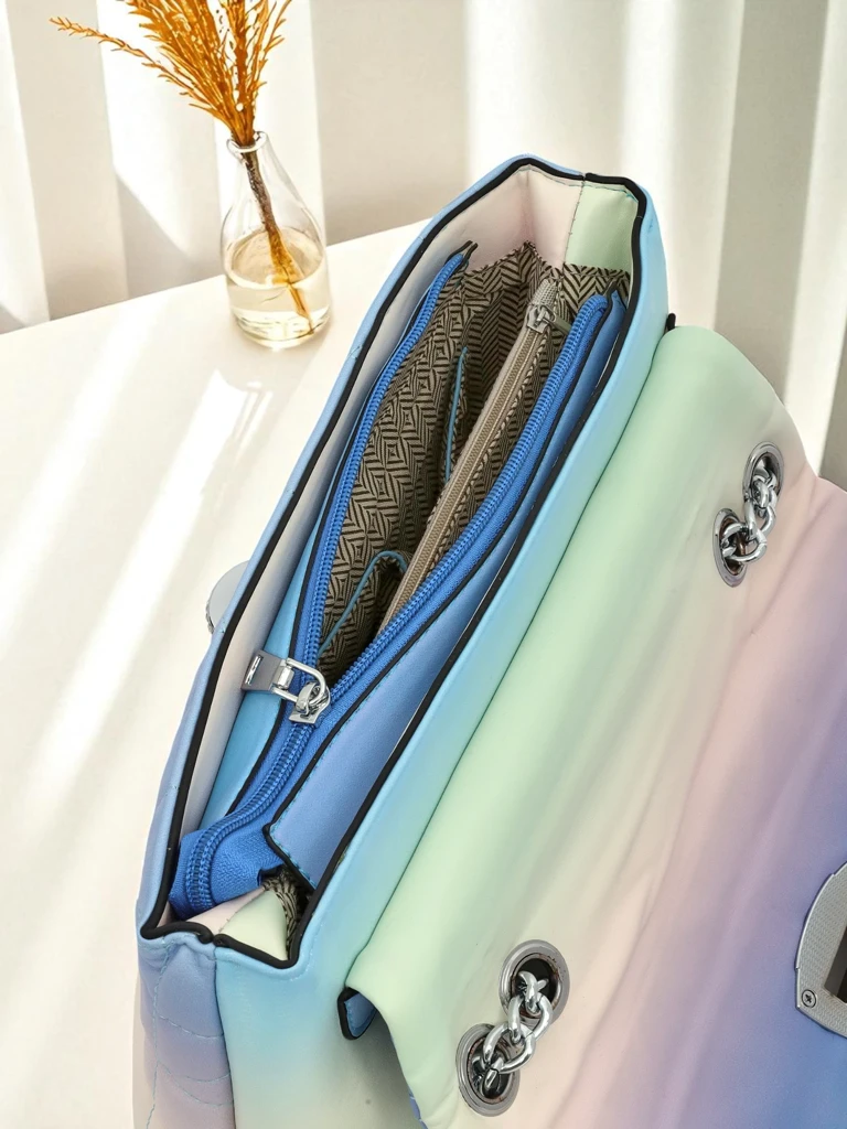 - Елегантна чанта тип плик от еко кожа с омбре ефект. Затваря се с цип и копче. Метална верига вместо дръжка добавя шик. 1 отделение, идеално за най-важните неща за вечерно излизане и специални поводи.