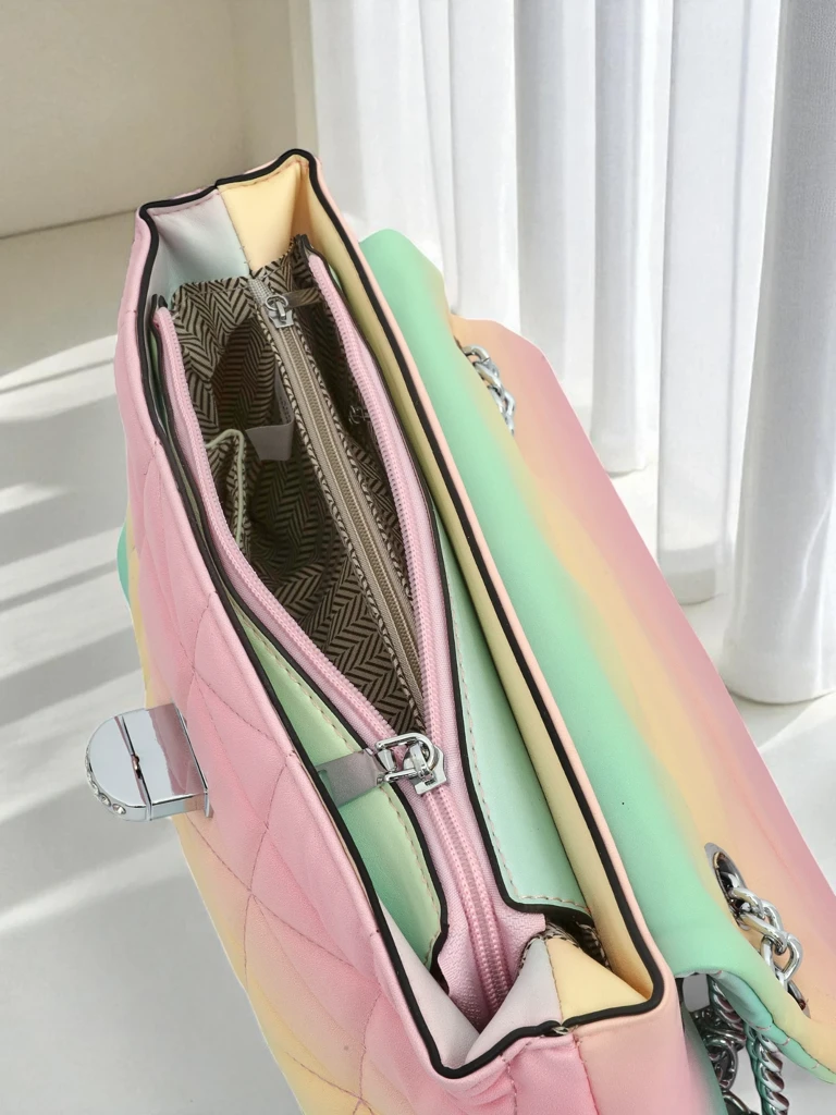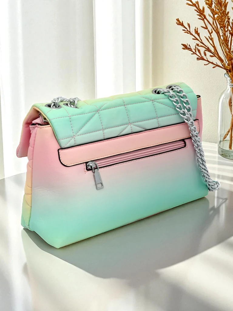 - Елегантна чанта тип плик от еко кожа с омбре ефект. Затваря се с цип и копче. Метална верига вместо дръжка добавя шик. 1 отделение, идеално за най-важните неща за вечерно излизане и специални поводи.